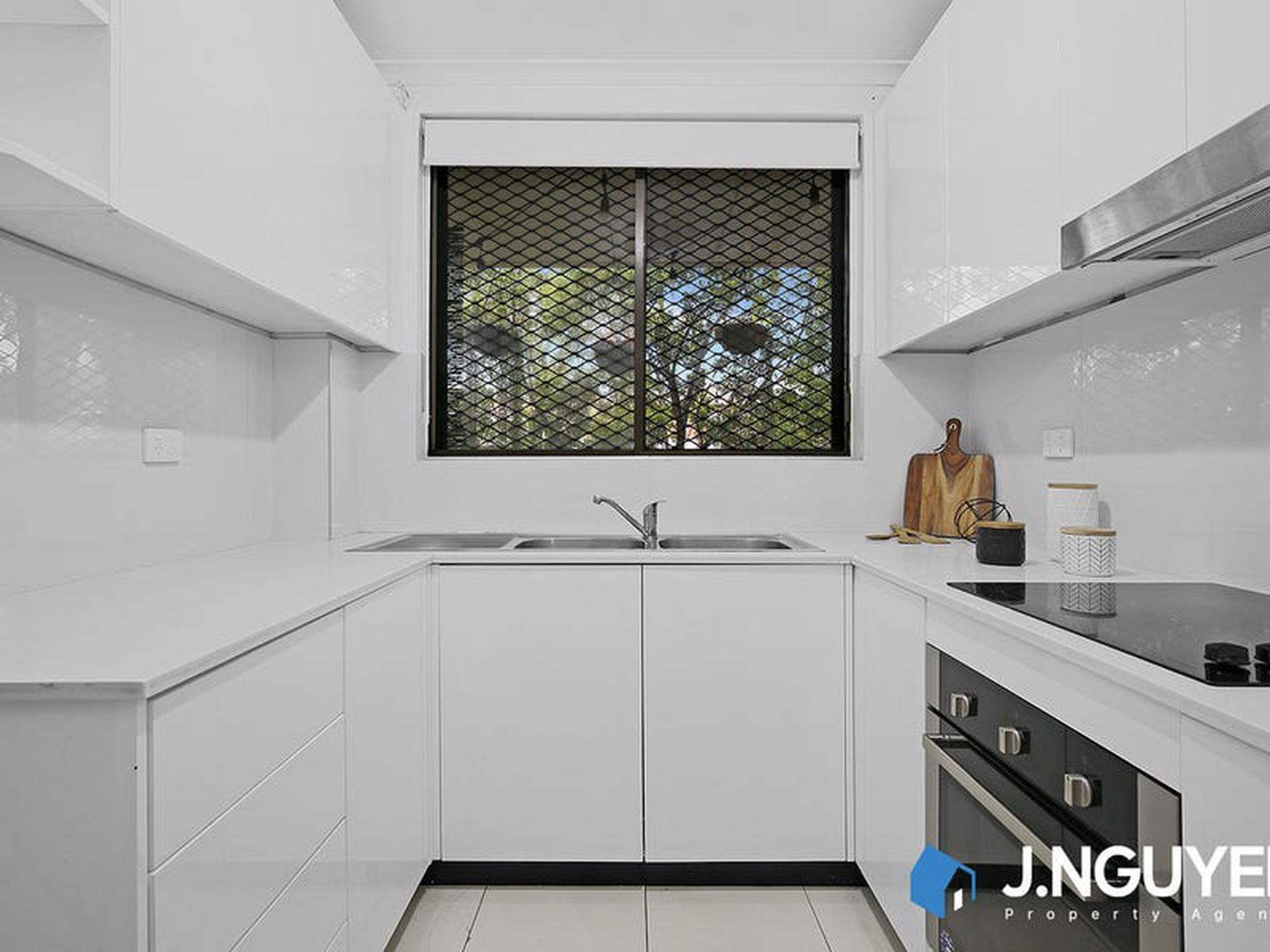 – Modern kitchen with stone benchtop quality stainless steel appliances (electric cooking, oven & rangehood)