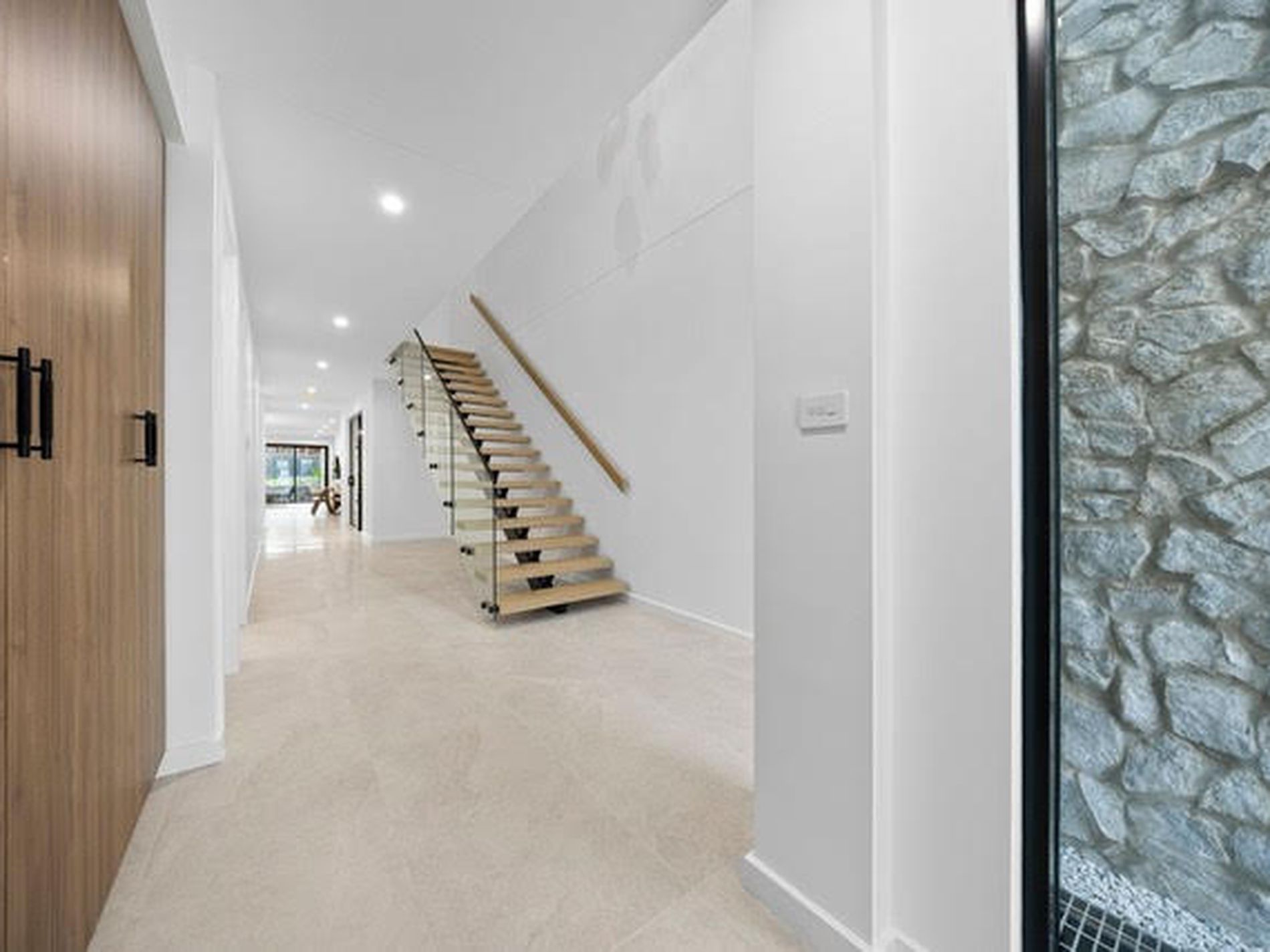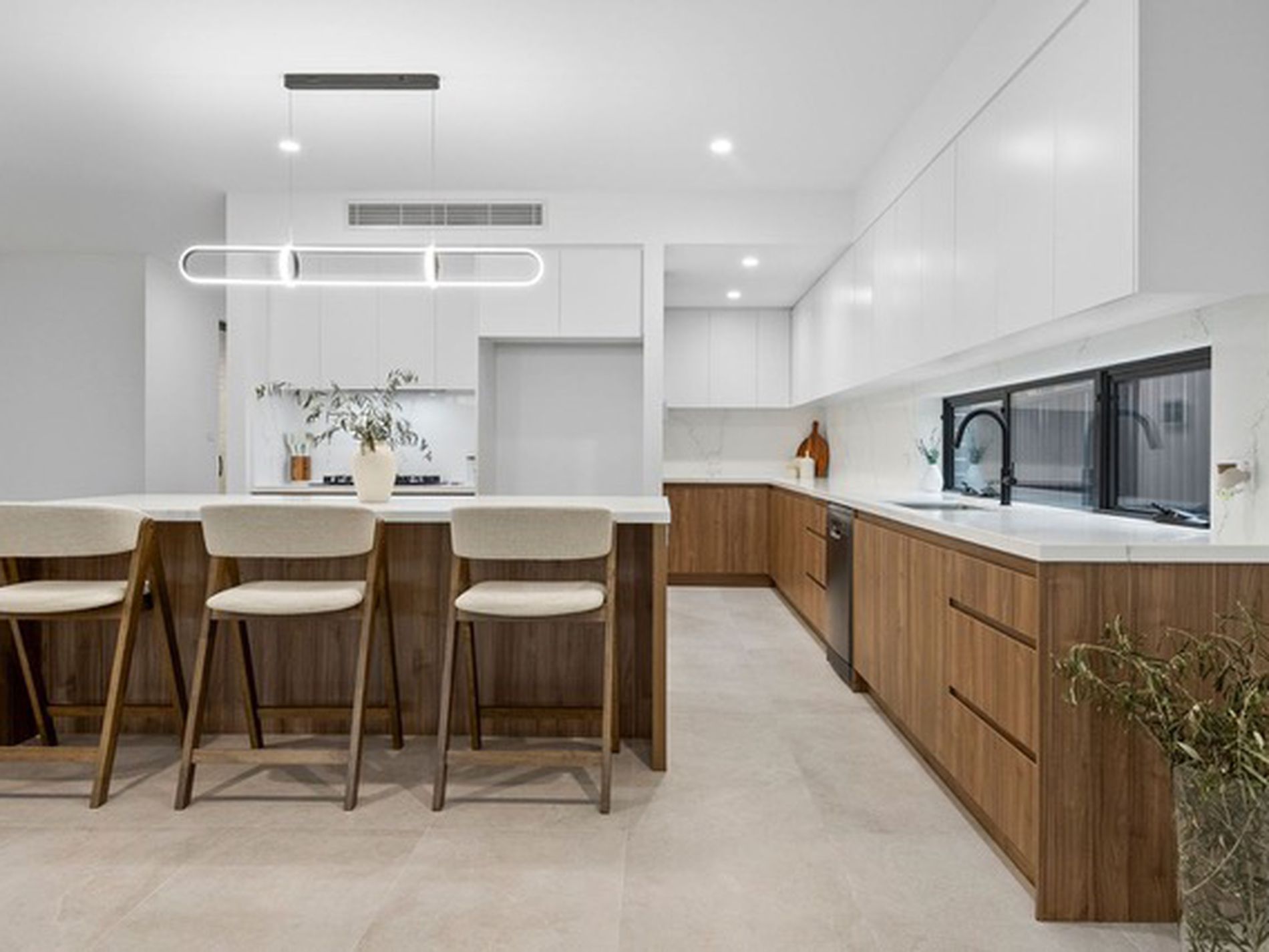 Soaring ceilings, feature American Oak staircase with glass balustrade, tiled lower level & timber upper level, ducted reverse-cycle A/C, modern gas fireplace and LED lighting throughout