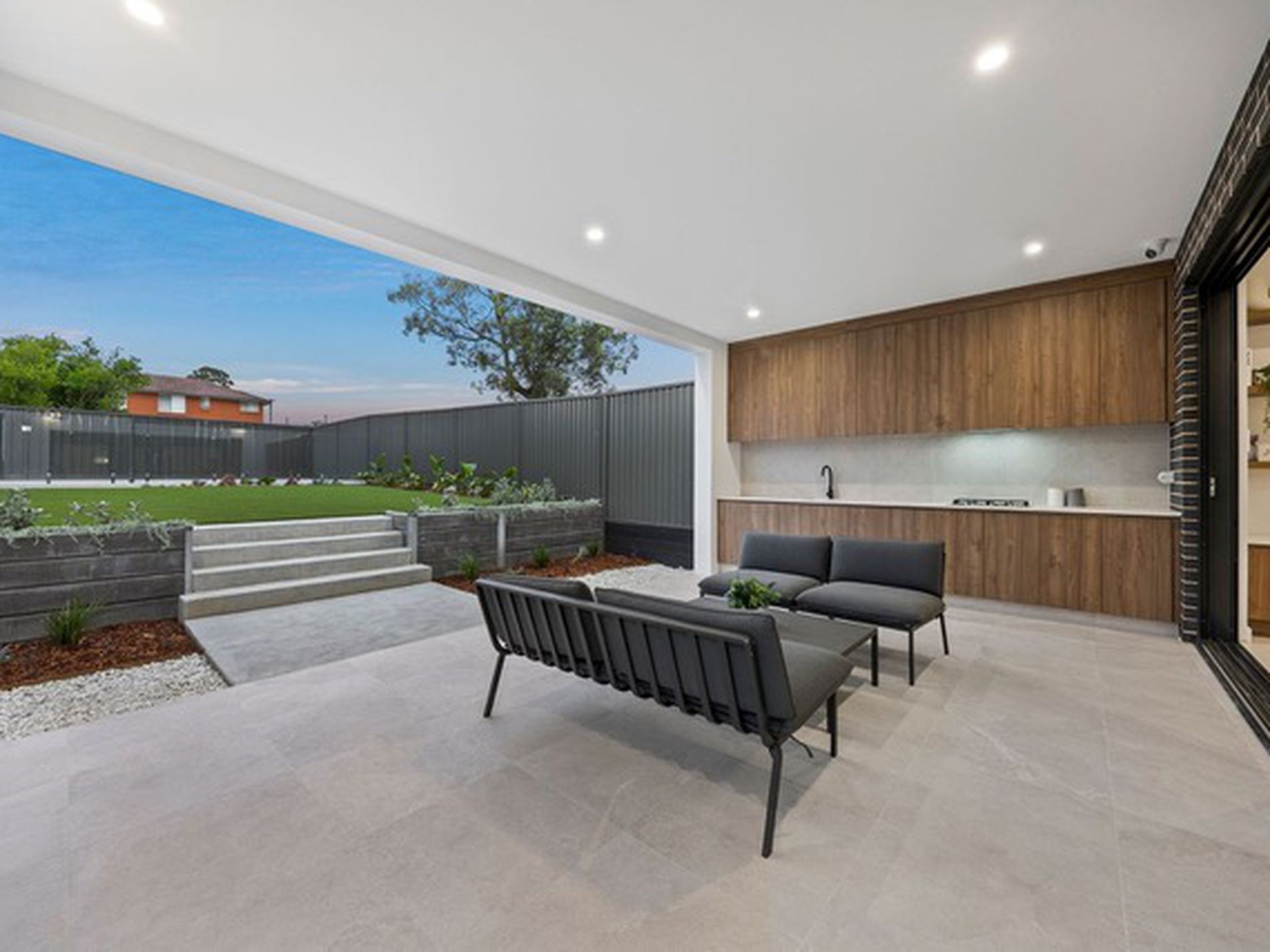 Undercover alfresco with full outdoor kitchenette overlooking low-maintenance gardens and sparkling in-ground pool