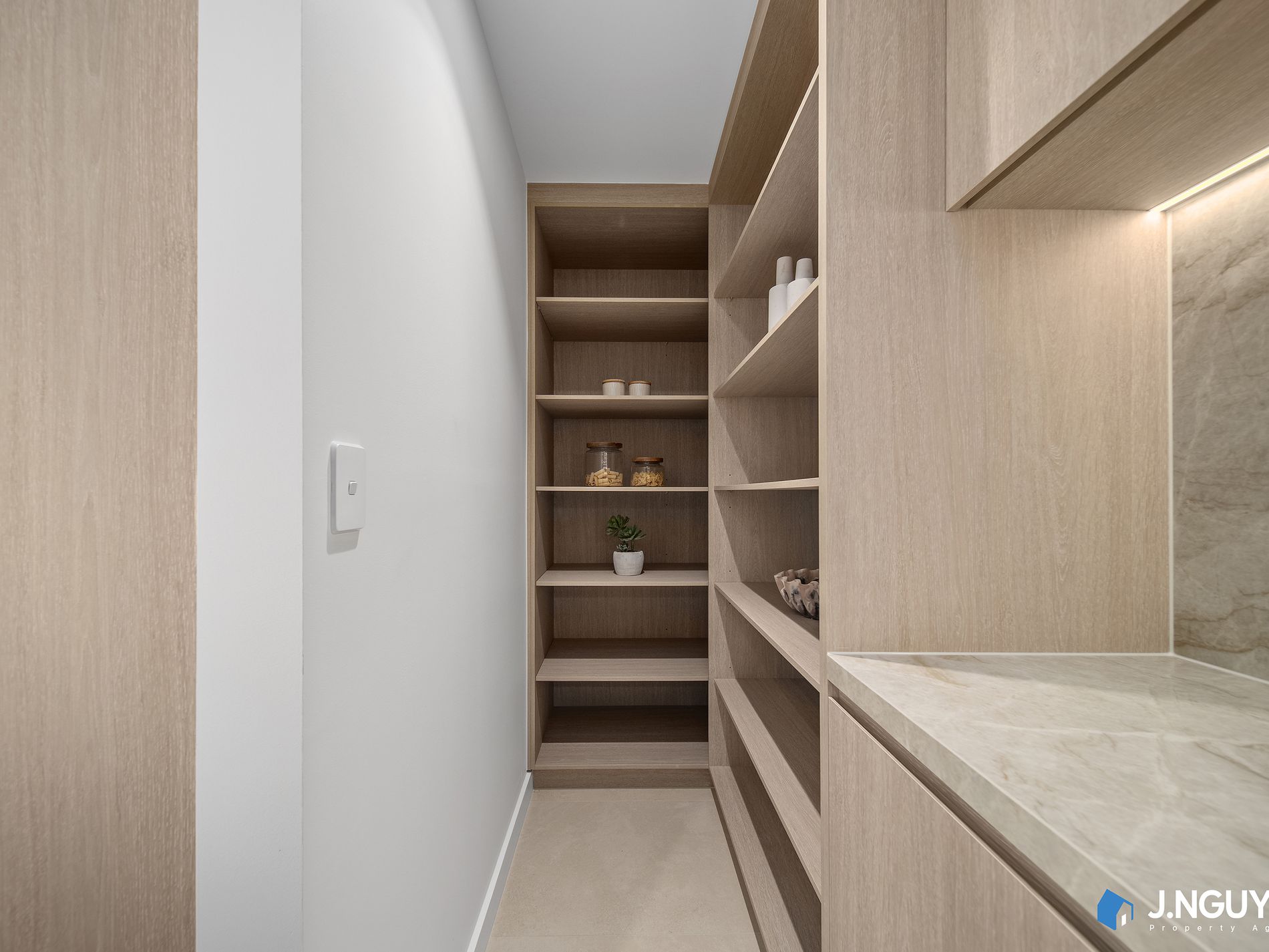 - Showpiece designer kitchen appointed with high-end appliances, sleek stone benchtops and splash back, custom cabinetry, and a generous walk-in pantry